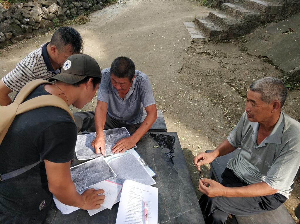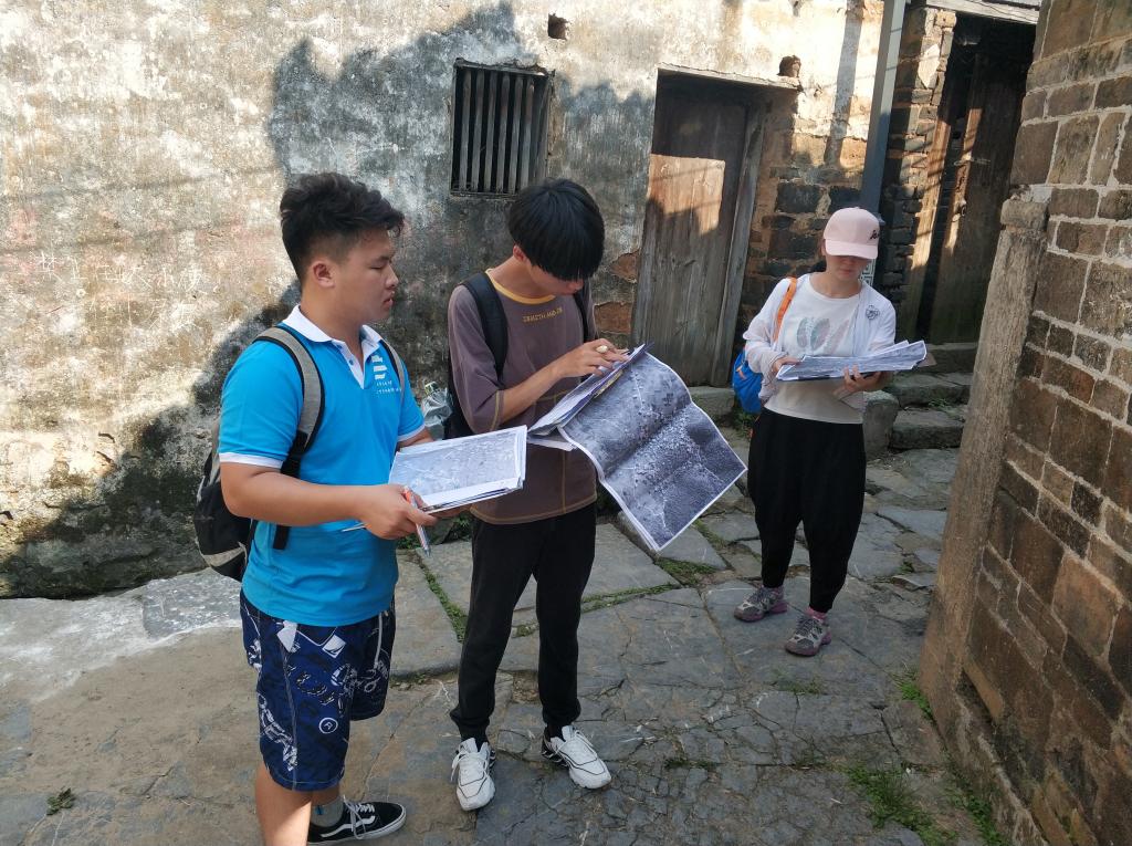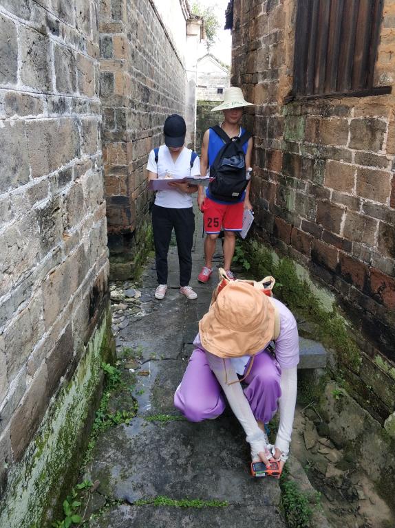 同一时间,在李欣原老师的带领下,另一部分实践团把整片古村落划分成A,B,C三个部分,并对A区块测绘工作,包括道路宽度和每一处建筑的现状和破毁程度等相关的场地现状。队员带上村落航拍地图,测距仪和风速仪在给每栋建筑做好相关标记,在细节上注意花纹形式和建筑结构组成,有条理地进行标注,同时包括新旧建筑的分布情况和道路排水设施的路网分布,并在地图上标记测量所得到的数据,为后期精品路线的规划提供原始数据参照和支持。烈日炎炎,实践团员一如既往地记录场地收集到的数据并拍下照片,做好照片序号与地图对照的工作。