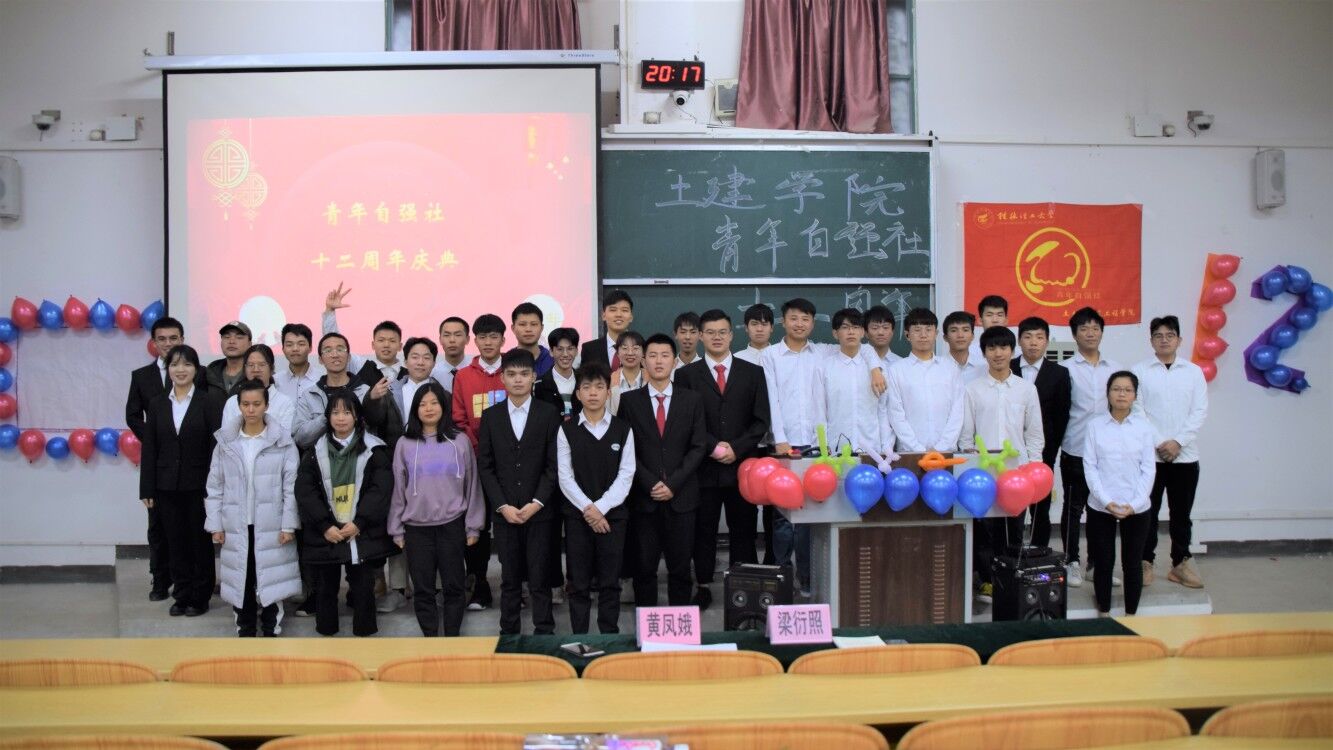 为了推动社团健康发展,弘扬社团文化,增强青年自强社成员之间的交流与了解,营造更加积极有爱的大家庭氛围的目的,表达对青年自强社的祝福与期盼。73882必赢最新官网土木与建筑工程学院青年自强社于12月28日在雁山校区举办十二周年庆典晚会,青年自强社全体成员参加本次活动。