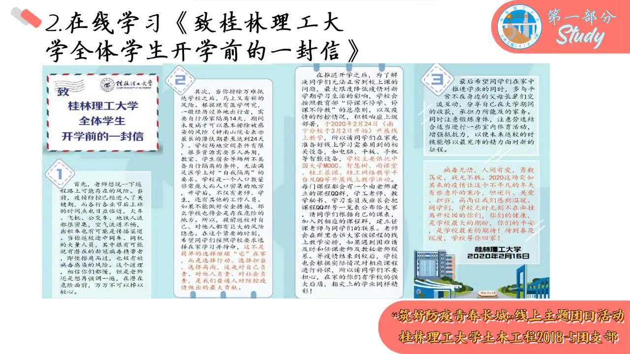 2月19日,土木工程2018-5团支部以线上直播的形式向支部成员呈现了一场有意义的线上团日活动,团日活动以“筑起防疫青春长城”为主题,主要围绕学习疫情防控知识,分享健康宅家体会与假期学习计划,开展抗击疫情线上承诺和号召创作优秀抗疫作品四个内容进行开展。