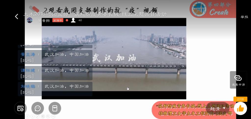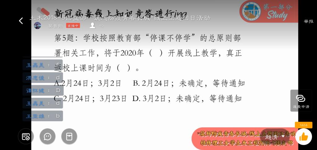 活动伊始,团支书莫普翔带领支部成员在直播间中一起学习学校关于疫情防控的文件,随后通过观看视频、知识竞答和连麦分享心得体会等环节让支部成员进行了更加充分的学习。随后,支部成员共同进行疫情防控承诺并签署抗击疫情承诺书并了解学校的疫情防控作品征集活动。活动接近尾声,支部成员一起观看了团支部制作的抗“疫”视频《Special Mask》后,班主任作本次团日活动的总结讲话。