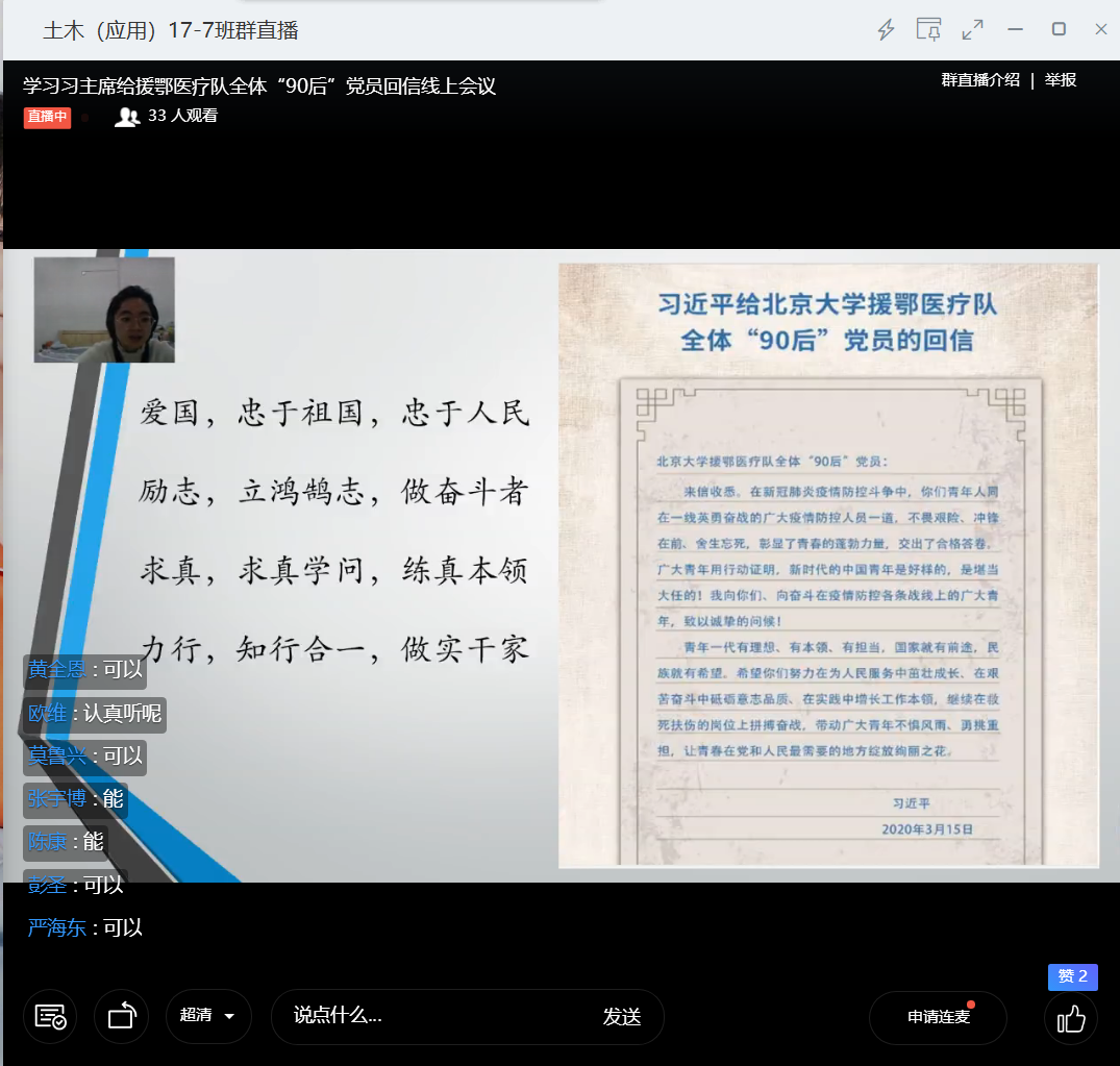 3月18日晚上19:00,2017级辅导员李明霞老师在钉钉网络直播平台和班级全体同学一同开展“学习习近平主席给北京大学援鄂医疗队全体‘90后’党员回信精神”线上会议。学院团委书记姚慧老师和2017级辅导员张宇博老师一同参加了本次会议。