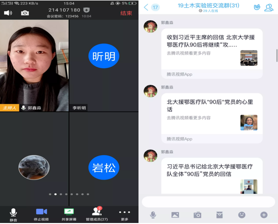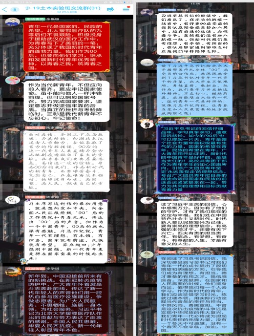 近日,中共中央总书记、国家主席、中央军委主席习近平给北京大学援鄂医疗队全体“90后”党员回信,向他们和奋斗在疫情防控各条战线上的广大青年致以诚挚的问候。为在团支部青年中弘扬不畏艰险、勇挑重担的精神,激励引导青年大学生为家国奉献青春力量,展现新时代中国青年的精神风貌,土木工程(实验)2019-1团支部于3月19日开展了一次学习贯彻习近平总书记给北京大学援鄂医疗队全体“90后”党员回信精神的线上主题团日活动,活动由团支部书记郭鑫淼主持。