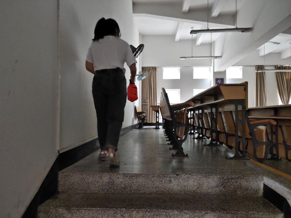 志愿者在屏风校区教学楼进行消杀