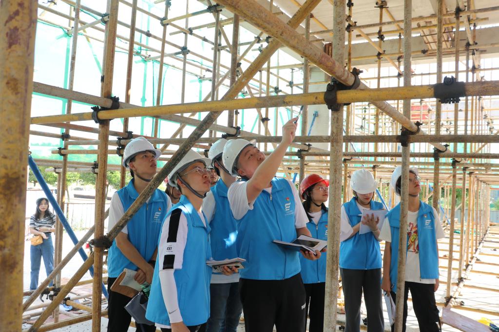 最后,实践团成员来到贺州学院学生宿舍楼项目中,与承建该项目的负责人袁诚进行现场交流沟通。该项目为六层装配式混凝土结构,装配率达到71%,总建筑面积15147.34平方米,在装配式技术的带动下,施工效率明显提升,但由于场地方面等制约条件,施工效率受到一定制约。同时,袁诚工程师表示:装配式技术在施工过程中对于工人素质方面要求提高,需要产业化的工人来带动装配式施工方面的整体提升,进而促进装配式技术的快速发展。
