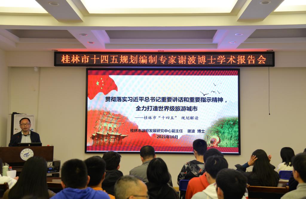 10月19日下午3时, 桂林市政府发展研究中心党组成员谢波博士在我校屏风校区4204会议室,为必赢官网师生开展了主题为“贯彻落实习近平总书记重要讲话和重要指示精神,全力打造世界级旅游城市——桂林市“十四五”规划解读”的学术讲座。讲座现场座无虚席。