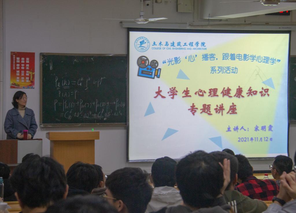 11月12日晚,土木与建筑工程学院“光影‘心’播客,跟着电影学心理学”系列活动之大学生心理健康知识专题讲座在屏风校区9201教室顺利开展。本次讲座邀请到我校心理咨询中心宋明霞老师为学生授课,由土木与建筑工程学院2020级辅导员唐子晴老师主持,以及各年级班级班长、团支书、心理委员与宿舍长前来参加讲座。