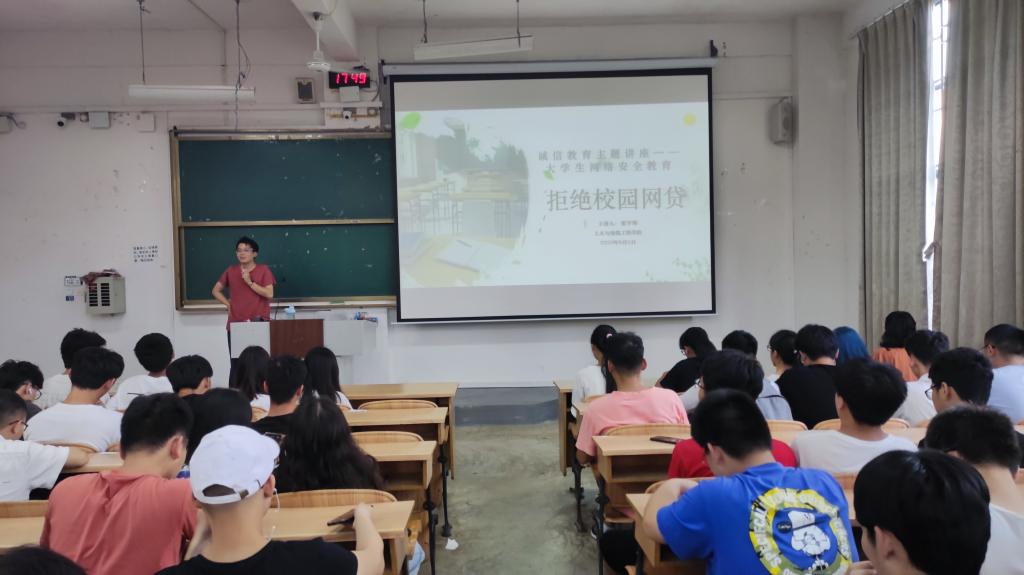首先讲座内容围绕从什么是网络贷款、什么是不良网贷、不良网贷的隐患、如何防范校园网贷、树立正确理性消费意识等五个方面进行了全面剖析。其次通过观看焦点访谈节目“《注销校园贷》骗局”,进一步加深学生对于变相“校园贷”的认识与理解。最后呼吁全体学生一是提升防范意识,谨慎使用个人信息,不要随意填写和泄露个人信息。二是对于推销的网贷产品,切勿盲目信任,尤其警惕熟人推销。三是作为一个成年人,要学会量入为出,适度消费。