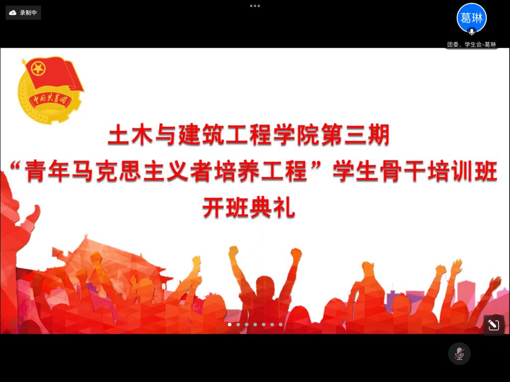 为深入学习贯彻党的二十大精神,以及习近平总书记关于对青年工作的重要讲话精神,扎实推进土木与建筑工程学院青年马克思主义培养工程,必赢官网于11月30日在线上开展第三期“青年马克思主义者培养工程”学生骨干培训班开班典礼,学院团委副书记安邦国老师、2021级辅导员张绪婷老师老师以及培训班全体学员参加了本次典礼,开班典礼由院团委办公室负责人葛琳主持。