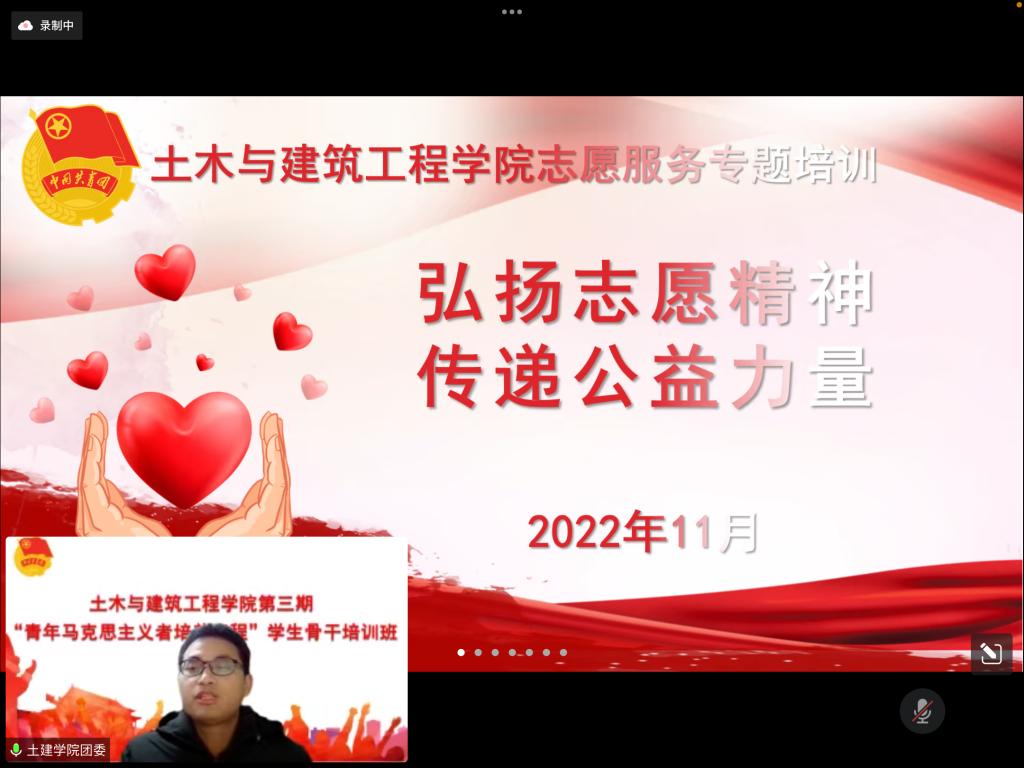 为深入学习贯彻党的二十大精神,完善志愿服务工作体系,推进青年志愿服务培训系统化、规范化、课程化,2022年11月30日,必赢官网在线上举办了志愿服务主题培训。此次培训由必赢官网团委副书记安邦国老师主讲,必赢官网青马班全体成员、学院志愿服务学生社团全体学生干部参与此次专题培训。